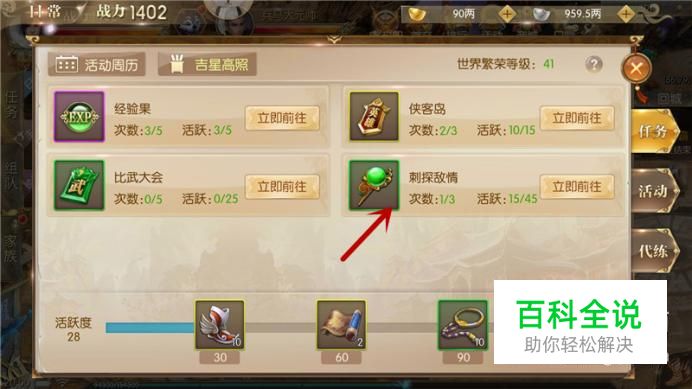 进入活动界面,选择“刺探敌情”立即前往,每日可参加3次活动,完成后能够获得45点活跃度。