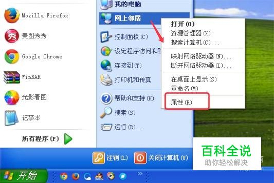 点击开始菜单,然后右键点击‘网上邻居’,在弹出的菜单上点击‘属性’
