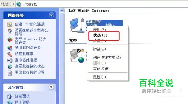 点击后打开了网络连接页面,右键点击上面的‘本地连接’,并点击‘状态’