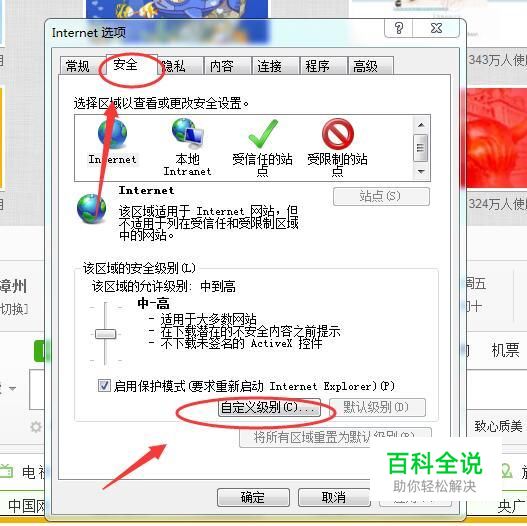 自定义级别 切换到【安全】选项卡,然后点击【自定义级别】,如下图所示: