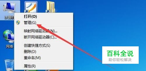 在Windows7系统桌面,右键点击“此电脑”图标,然后在弹出的菜单中选择“管理”菜单项