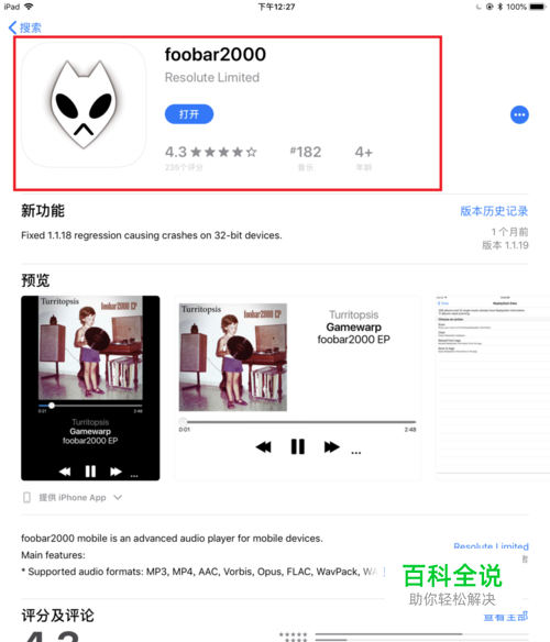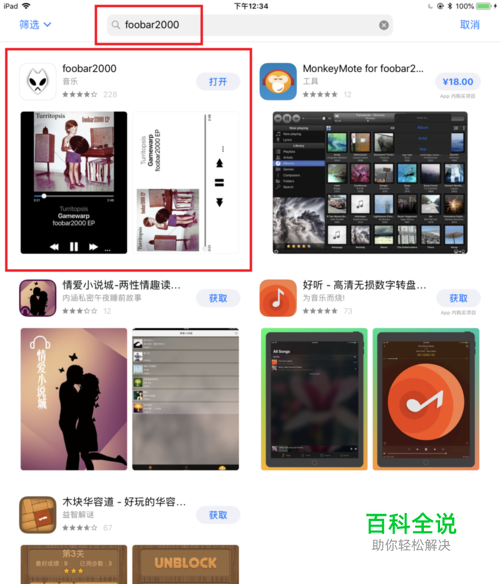 1. 打开苹果设备的App store搜索并下载foobar2000。(因为我已下载,所以显示的“打开”)。