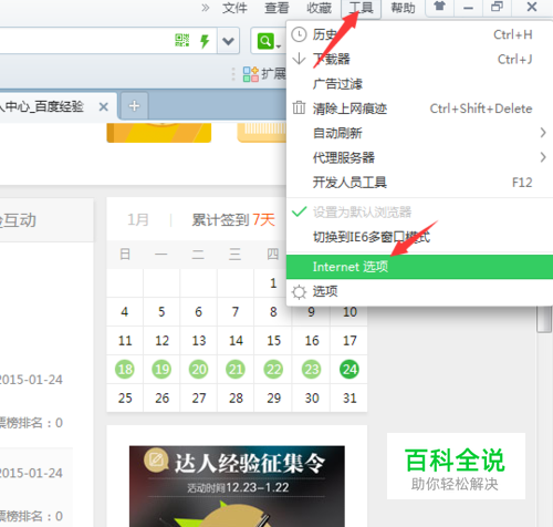 打开浏览器,点击工具菜单,选择Internet选项