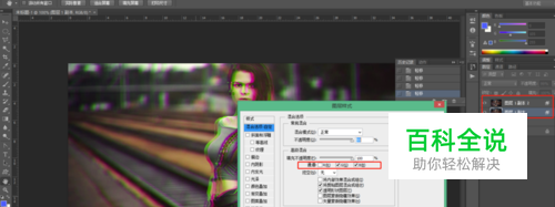 观察一下图片,首先实现红绿重影效果,这个比较简单,打开图片后,按两次Ctrl + J组合键,复制两份图层,然后双击一个复制的图层,打开图层样式窗口,在混合选项-->高级混合里,把R选项勾选掉,关闭图层样式窗口,选择移动工具,将此图层往左移动一点,看出效果了吧。同理,再一个复制的图层里,将样式窗口的混合选项中的G勾选掉,将此图层向右移动一点,第一步完工。手抖就吃点药继续。