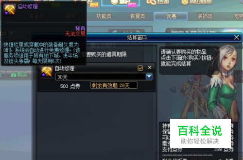 说到修理费,大家都知道商城 优惠, 魔王契约中有“ 自动修理”,账号通用。 一个月才500点券,支持代币券购买,以现在的金币比例,一个月只需要200w左右。 而每天每个角色可以自动修理6次,只要你身上装备有耐久归0了,便会自动修。 但是快捷栏装备是不会自动修理的。