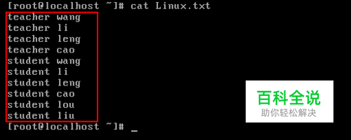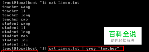 使用管道符显示root目录下Linux.txt文件下包含teacher文字的行。演示中会使用到一个文字查找命令grep,后续会做更为详细的介绍,这里仅说明grep命令可以接受标准输入。