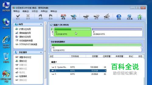 任务环境:假设用户的Windows 7系统中有一个36GB磁盘,其上有3个分区,一个是100MB的保留分区E盘,第二个是系统分区C盘15.01GB,第三个是数据分区F盘20.89GB。