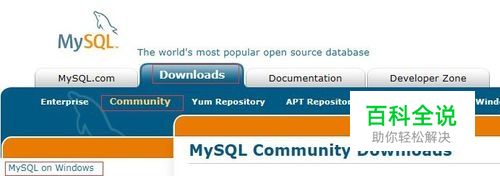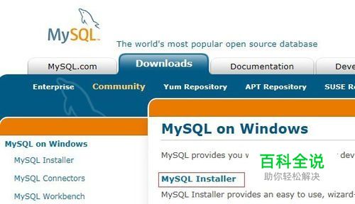 Windows系统安装版本下载,进入官网首页-Downloads-Community-MySQL on Windows-MySQL Installer,选择安装包的下载链接点下载。