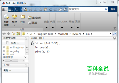 第一步:我们需要使用plot命令绘制一个图形,绘制图形的MATLAB程序代码如下: a= [0:0.2:30]; b= cos(a); plot(a, b) 我们将此代码添加到MATLAB中,如下图所示。