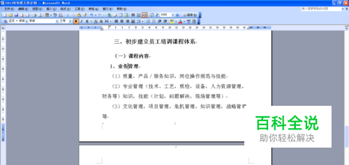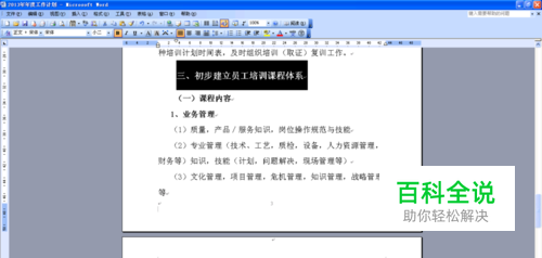 找到全文中加粗且以大写的一、二、三、。。。。为开头的文字,做如下操作,现以“三、初步建立员工培训课程体系”为例说明。选中文字“三、初步建立员工培训课程体系”