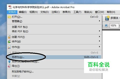 打开pdf文档,首先第一步选择另存为,特别从网上下载的pdf文档,通过这个方式可以将文档的体积减少不少,如图所示
