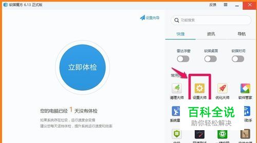 点击系统桌面软媒魔方图标,启动软媒魔方程序,在打开的软媒魔方窗口,我们左键点击:设置大师;