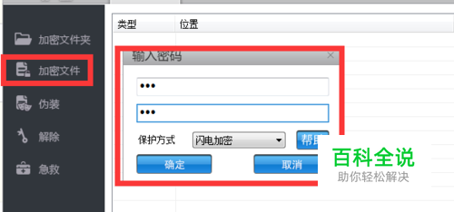 在输入密码框中,设定密码,确保两次一样的哦~切切选择保护的方式——闪电加密或者隐藏....,最后确定