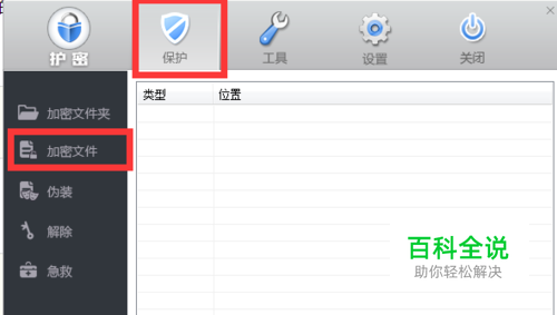 点击进入后,单击运行窗口上方的“保护”,并在选定的“加密文件”按键中将需要加密的文件逐一添加到软件列表框中,文件数量不做限制。