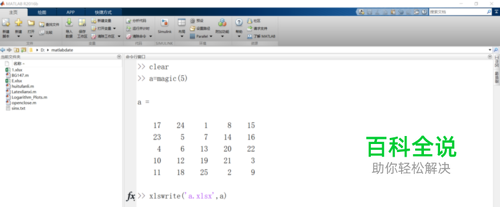 打开Matlab软件,本经验所使用的软件版本为Matlab2016b。找到需要保存的数据变量,在命令行窗口输入格式为 xlswrite('文件名.xlsx',要保存的变量名称)并按下回车。在这里我以保存变量a中的数据为例,我们要将变量a存储在名为a的Excel表格中,先建立一个5X5的magic矩阵(magic矩阵的特点是矩阵的行、列、对角线之和均相等),并将矩阵的值赋给a。在命令行窗口输入“xlswrite('a.xlsx',a)”并回车,特别注意,在输入的时候没有“ ”,且需要在英文输入法下输入