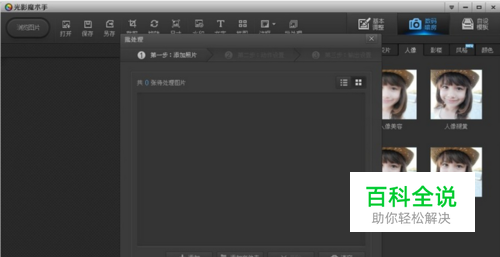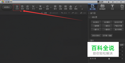 用光影魔术手自由裁剪图片那么首先我们的把软件打开,打开后进入首窗口后,看到首窗口里面的打开按钮,点击选择。