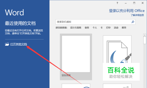 1、鼠标左键双击计算机桌面Word2016程序图标,将其打开运行。并点击“打开其他文档”选项。打开需要编辑的Word文档。如图所示;