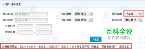 若想购买已备案域名,在是否备案中选择已备案,然后点搜索即可。另外更快捷的可以点击快速查询导航。 若想购买数字域名或拼音域名,可以在域名类型里面,选择您所需的类型。 查询结果得出后,选择您喜欢的域名,然后看到右侧,购买列中的GO,点击就可以进入购买页面。如下图: