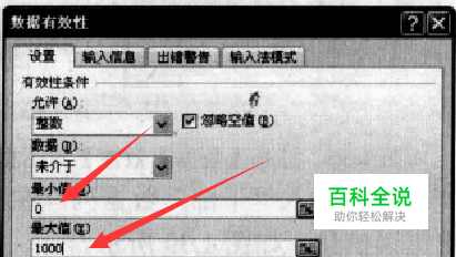第二步,设置数据有效性参数。在[数据有效性]对话框中的[数据l选框中选择[未介于]选项,在【最小值】选框中输入0,在【最大值】选框中输入1000,如图