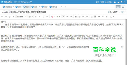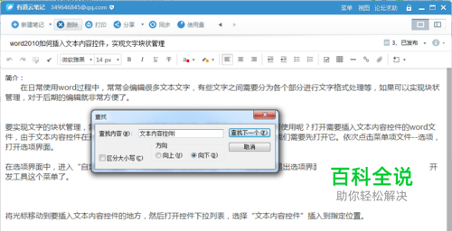 在有道云笔记中,经常记录笔记,文字会比较多,有时需要替换一些词组。例如下面的一篇经验《word2010如何插入文本内容控件,实现文字块状管理》要替换当中的【文本内容控件】这几个字。