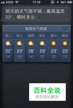 Siri妙用:问天气。当然生活中每天的衣食住行也是非常必要的了,比如,我们要出远门,或者去哪玩,就得问问天气了,操作:长按home键开启Siri功能,然后对其说”明天的天气情况“Siri就会给出我们反馈出结果了。