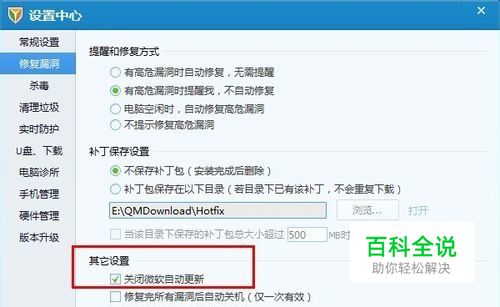 原因二:可能系统中的Windows update已经启动了。 解决方案:在管家设置中心关闭微软自动更新(如图),更改设置后重启电脑,然后尝试修复漏洞!如果再不能成功,请往下看!