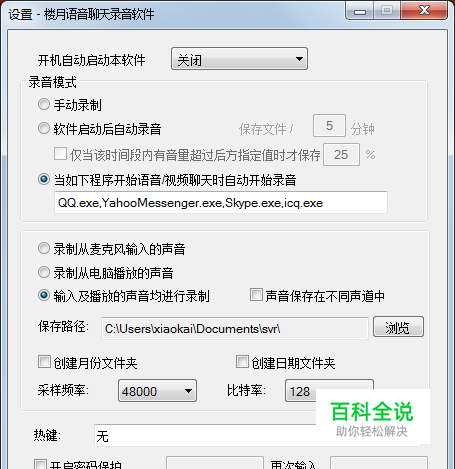 其实,安装完成后,软件就会自动对QQ视频时进行录音了。也就是当您与别人进行QQ视频会议时,本软件将自动对QQ进行录音。您是不需要点击“开始”及“停止”按钮来手动及结束录制的,软件会在全自动模式下完成录音。当然,我们也可以点击“文件”“设置”菜单来看看软件的设置界面。但我们通常不需要修改这些设置。使用默认设置即可。