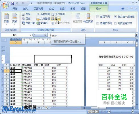 第4步,返回Excel2007工作表窗口,在页眉或页脚区域以外的任意位置单击鼠标左键,即可看到被插入到页眉或页脚中的图片,如图2009063011所示。 图2009063011 在页眉或页脚中插入图片