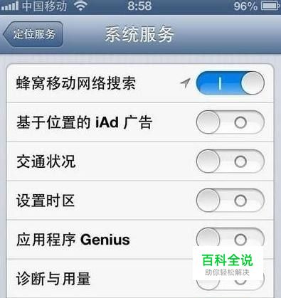定位服务通常,手机的耗电力高至低分别是:GPS(定位) > 3G > Wi-Fi >蓝牙,因此首要的省电设置是定位服务设置。进入iPhone“设置”菜单,选择“隐私”-“定位服务”,打开最下面的“系统服务”,关闭“基于位置的iAD广告”和“设置时区”等一系列没用的功能,只保留“蜂窝移动网络搜索”和“指南针校准”即可。如下图所示。