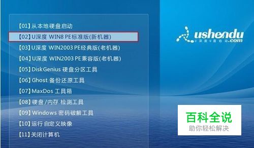 将u深度u盘启动盘连接至电脑,重启等待出现开机画面按下启动快捷键进入到启动项选择窗口,选取【02】U深度WIN8PE标准版(新机器),按下回车键执行操作,如图所示: