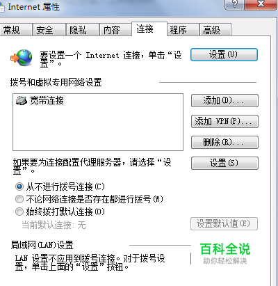 在浏览器中,选择“工具”——“Internet选项”——“连接”,