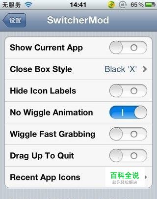 Show Current App 显示当前软件(不推荐打开) Close Box Style 左上删除角标的风格(1无角标 2红色减号角标 3黑色叉号角标) Hide Icon Labels 隐藏图标标签文字,即不显示软件名称 No Wiggle Animation 无抖动效果(这个貌似开没开都没有抖动的效果,不知道为啥) Wiggle Fast Grabbing 剪短长按图标时间(这个功能没啥用了,直接打开多任务栏就有“-”了) Drag Up To Quit 拖动图标向任务切换栏以外的地方放手可以关闭任务后台 Recent App Icons 选择Normal可以显示最近使用过的但未占用内存的Apps(半透明图标),选择Close则自动关闭未占用内存的Apps Inactive Recent Icons Alpha % 半透明图标的透明程度