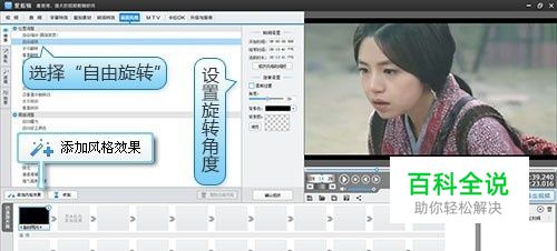 二、用“自由旋转”快速实现视频旋转 找到“画面风格”面板的“画面”栏目,选中“位置调整”列表的“自由旋转”,点击“添加风格效果”一键添加, 在“效果设置”面板中调整旋转角度。还可以为画面添加个性时尚背景。