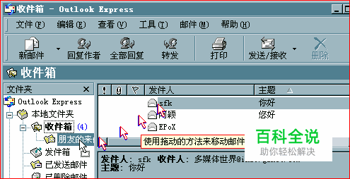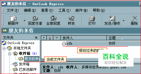 下面我们把刚收到的来信放在新文件夹“朋友的来信”中:用鼠标点一下“收件箱”,在邮件列表中选择来信,然后拖动鼠标到文件夹“朋友的来信”上,再松开鼠标按键,刚收到的邮件就移动到“朋友的来信”中了。