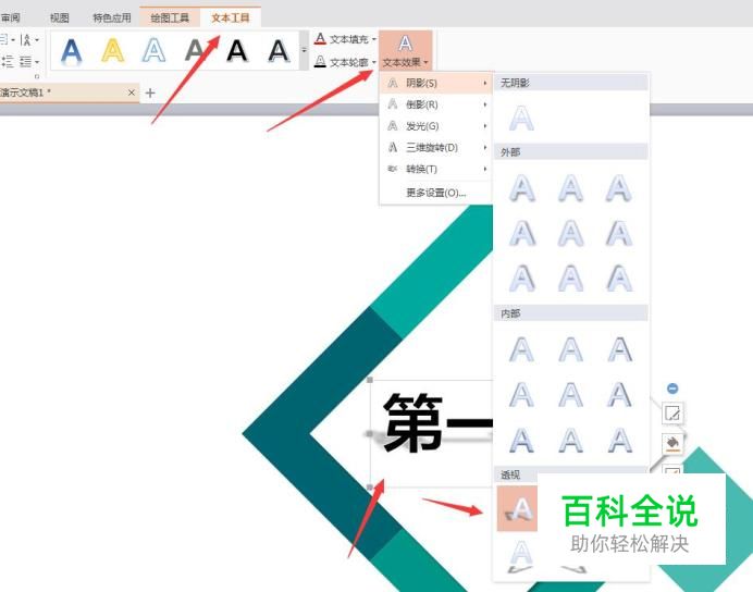 选中文字,点击【文本工具】--【文本效果】--【阴影】--【透视】;