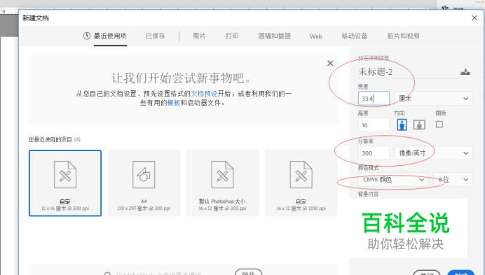 新建一张空白画布,参数如下图,300像素,颜色模式选择CMTK,33.4 * 16.4厘米的规格,其中,多出来的0.4厘米在打印的时候时不会打印出来的,行业内叫出血位