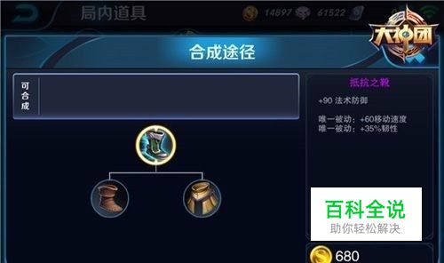 抵抗之靴 因为这是一个射手,而且是一个没有位移技能的射手,所以前期是不太占优势的,第一件就要出这样一双鞋,来克服他速度慢的问题。这双鞋是法抗写,也就是可以有110的法术防御,这样就不是很怕对面法术英雄空自己了。还能增加35%的任性,这就使得它在游戏中能游刃有余了。