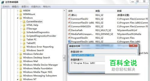如果是64位的操作系统,可能还会有ProgramFilesDir (x86)字符串,以同样的方法将数值数据中的安装路径修改成其他分区→确定即可。