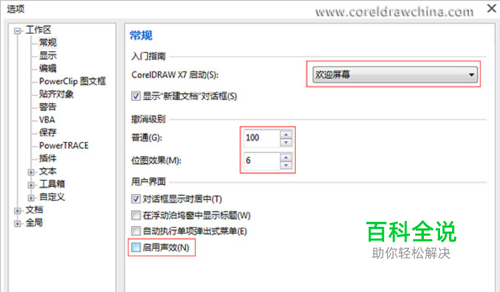CorelDRAW X7中优化设置1:单击位于工作区下方的常规标签,右边对应的是针对常规标签的基本设置。欢迎屏幕可以根据个人喜好自己更改。撤销级别就是你在 CorelDRAW X7中按Ctrl+z的步数,如果你的电脑配置够好,可以相应的设置多一些,不过要注意的是撤销级别太多会占用大量内存。用户界面中的启动声效,就没必要 选择了。