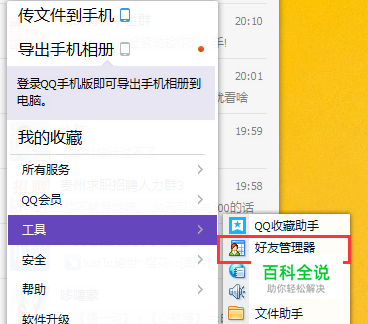 点击左下角的【主菜单】,将鼠标放在工具上,然后再点击【好友管理器】。