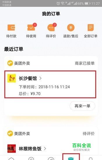 第一步在我们的手机中打开美团,点击底部的订单,选择要修改收餐手机号的订单进去,如下图所示: