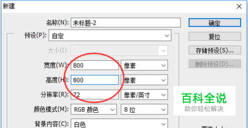 打开Photoshop软件,新建一个宽度和高度均为800像素,分辨率为72的画布。