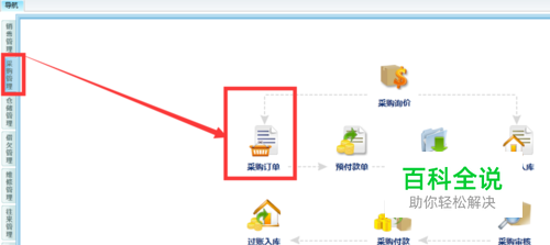 然后点击网页做左面一排的采购管理,之后就会如下图,系统会出现与采购有关的所有单据名称,点击采购订单。