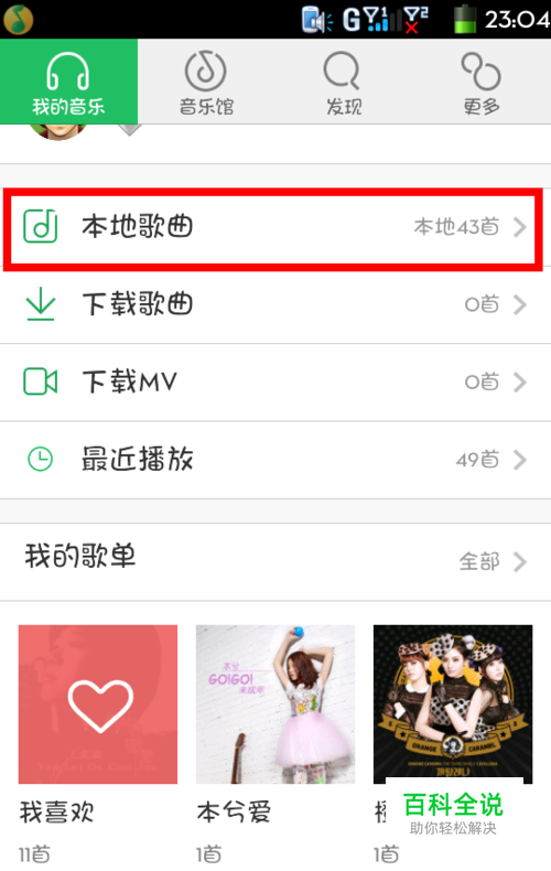 打开手机QQ音乐后的界面, 点击图片中红色的小框框 进入“ 本地歌曲”。