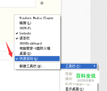 从右键菜单中点选工具栏选项后,我们发现在工具栏选项的旁边会再次出现一个下拉列表,这里我们点击√选“快速启动”。