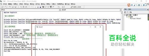 进入编写代码窗口,在如图位置添加下面的API函数代码 '窗口透明API Private Declare Function SetLayeredWindowAttributes Lib "user32" (ByVal hwnd As Long, ByVal crKey As Long, ByVal bAlpha As Byte, ByVal dwFlags As Long) As Long Private Declare Function GetWindowLong Lib "user32" Alias "GetWindowLongA" (ByVal hwnd As Long, ByVal nIndex As Long) As Long Private Declare Function SetWindowLong Lib "user32" Alias "SetWindowLongA" (ByVal hwnd As Long, ByVal nIndex As Long, ByVal dwNewLong As Long) As Long '窗口透明常数 'Const WS_EX_LAYERED = &H80000 Const GWL_EXSTYLE = (-20) Const LWA_ALPHA = &H2 Const LWA_COLORKEY = &H1