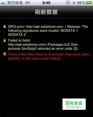 1)出现黄字Failde to fetch和一行红字 这种情况可能是源服务器抽风,可换个时间段刷新。如果仍若不行,有可能是被屏蔽了。使用移动的卡的GPRS网络或者移动的Wi-Fi容易被屏蔽,检查方法:在管理—软件源中,如果看到bigboss和saurik等外国源是空白的,说明被屏蔽。或者用safari浏览器打开http://apt.saurik.com,如果打不开也说明被屏蔽了。可尝试换其他网络进行操作。 提示:Failed to fetch http://Cydia.zodttd.com/repo/Cydia/dists/stable/Release.gpg Bad URL 解决:错误链接 当前网络状况不好,请稍后再试 提示:http://repo666.ultrasn0w.com/./zh_CN.bz2 POSIX:Socket is not connected ultrasn0w 解决:服务器无响应当前网络状况不好,请稍后再试 提示:http://apt.thebigboss.org/repofi ... /stable/Release.gpg POSIX:Socket is not connected 解决:bigboss服务器无响应当前网络状况不好,请稍后再试