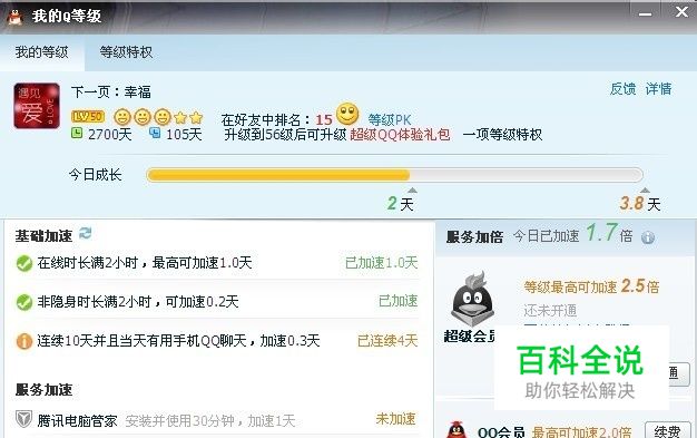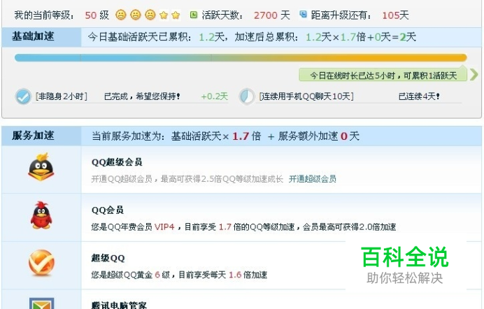 具体方法,基础加速:QQ在线2小时,非隐身在线2小时,连续10天QQ聊天这个大家都懂吧,服务加速:免费版,QQ电脑管家使用30分钟,记得帐号登录即QQ帐号,QQ手机游戏即手机QQ里的QQ游戏中心玩下游戏即可获取加速;付费版,只需开通任意一个付费服务即可,最多只能开通两种,超级会员是会员的升级版,无论开通几种,只以里面那个加速倍速最高的那个计算不叠加下面再详细介绍从图中可看出我开通了QQ会员和超级QQ,里面QQ会员加速比超级QQ高,所以最终按QQ会员的计算
