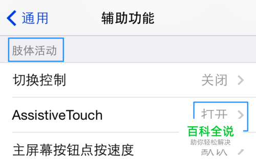 在下图中可以看到,切换控制和 AssistiveTouch(虚拟按键)都同为肢体活动中的功能。当前 iOS 系统中只允许二者之间只有一个被激活打开,而我当前在手机上打开了 AssistiveTouch 功能,如图所示