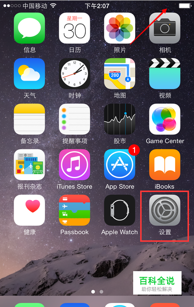 在主屏上我们可以看到这时右上角电池并没有显示电量百分比,我们点击打开设置